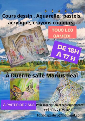 Cours de dessin Publication publiée :20/09/2025 Tous les samedis après-midi salle Marius Déal Inscriptions et renseignements au 06 71 79 48 03