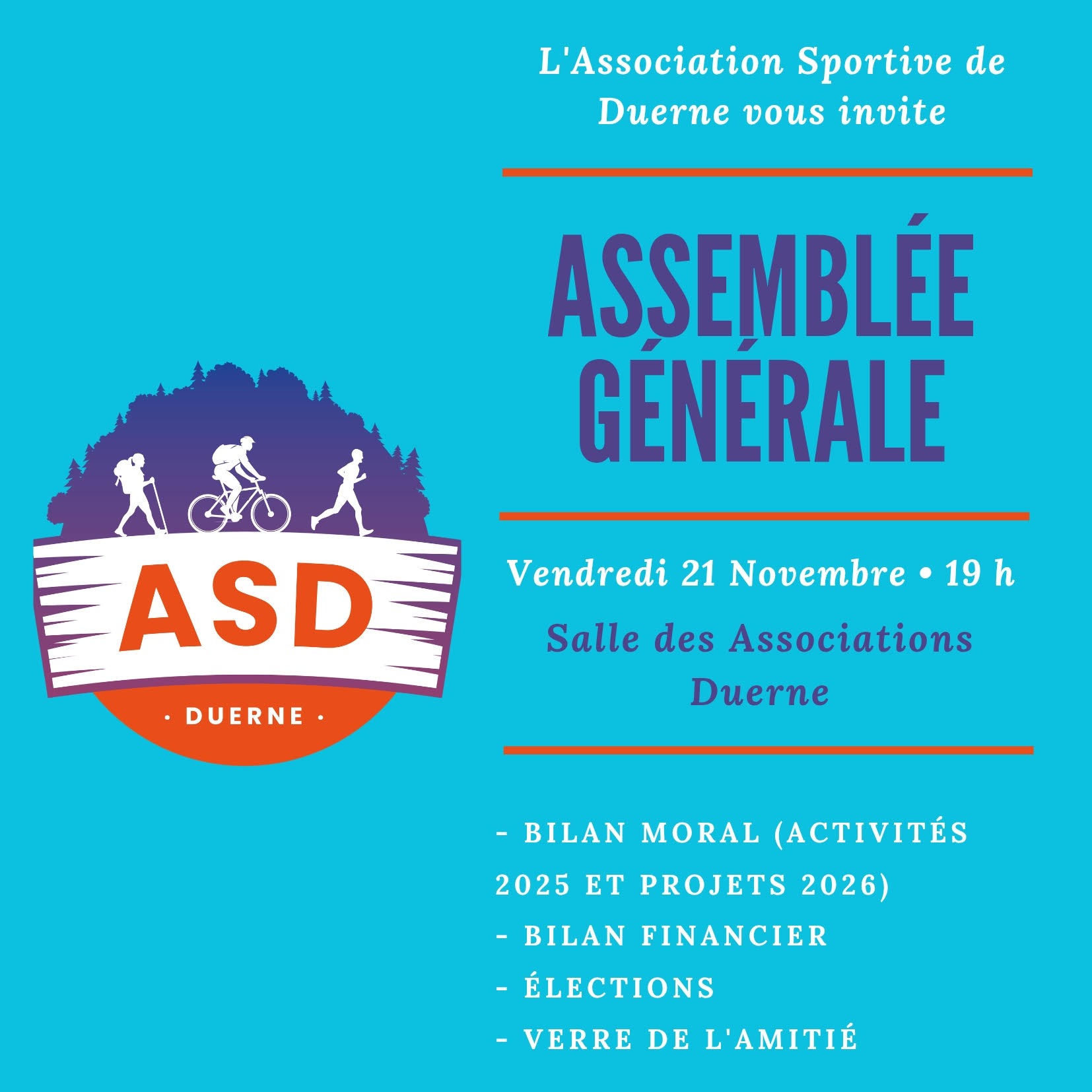 Assemblée générale de l’ASD Le vendredi 21 novembre 2025 à 19h aux vestiaires du stade + Ajouter à mon Agenda Google + iCal / Outlook export Date 21 Nov 2025 Expired! Heure 19h00 - 22h00 Partagez cet événement