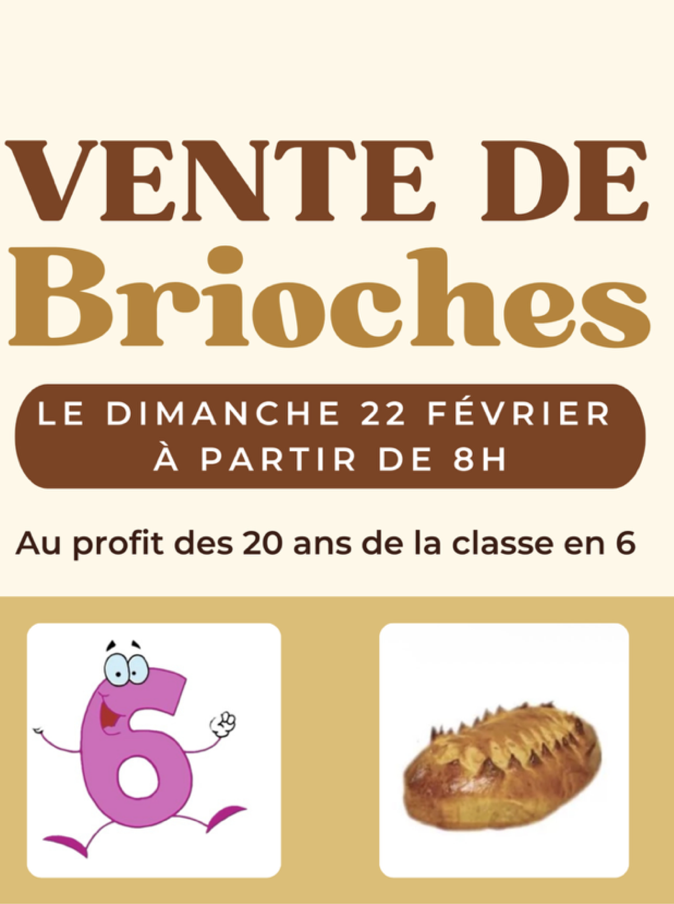 Vente de brioches par Les 20 ans de la Classe en 6 dimanche 22 février 2026 à partir de 8h + Ajouter à mon Agenda Google + iCal / Outlook export 00 jours 00 heures 00 minutes 00 secondes Date 22 Fév 2026 Heure 8h00 - 13h00 Partagez cet événement